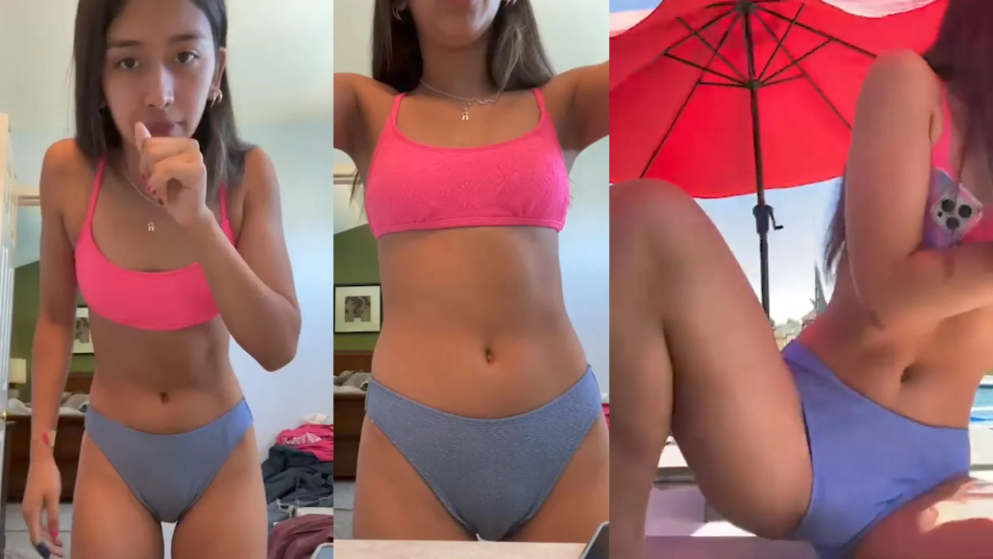 Mature brunette teenager in bikini with defined lips (cameltoe)