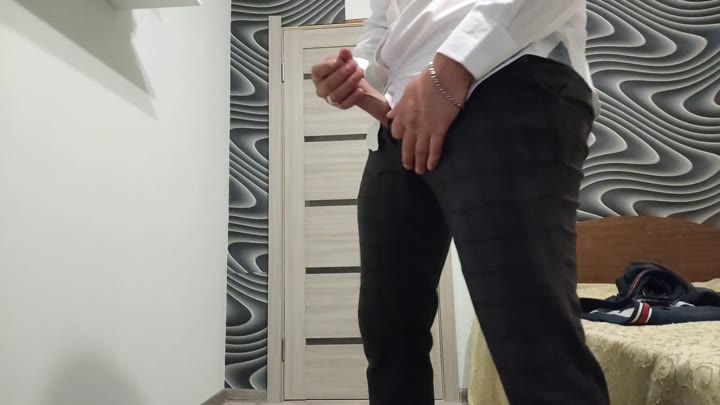 Russian young guy in suit jerks off and cums